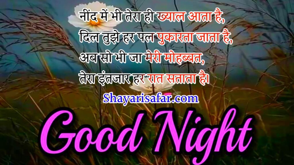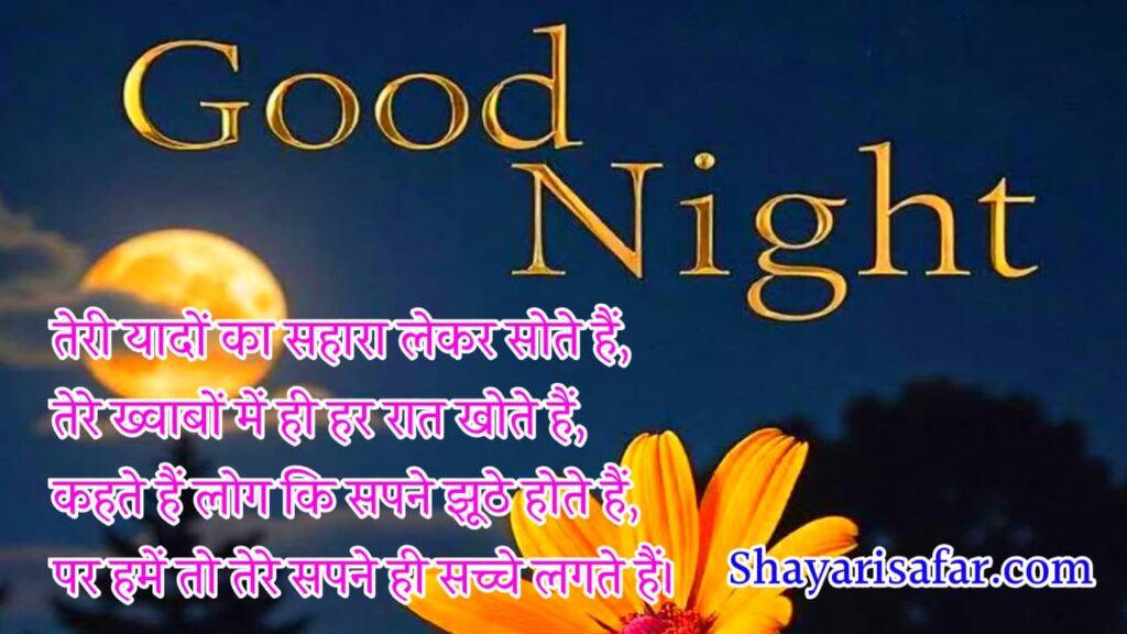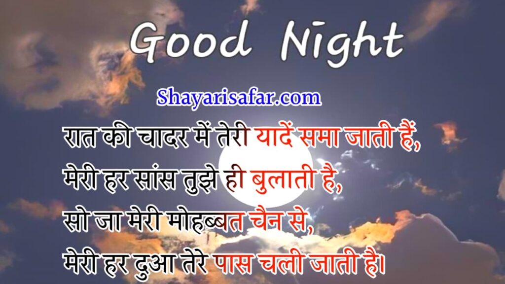 Good Night Shayari यह दिखाती है कि आप दिन के आखिरी पल में भी उसी इंसान के बारे में सोच रहे हैं। यही सच्चा प्यार होता है।